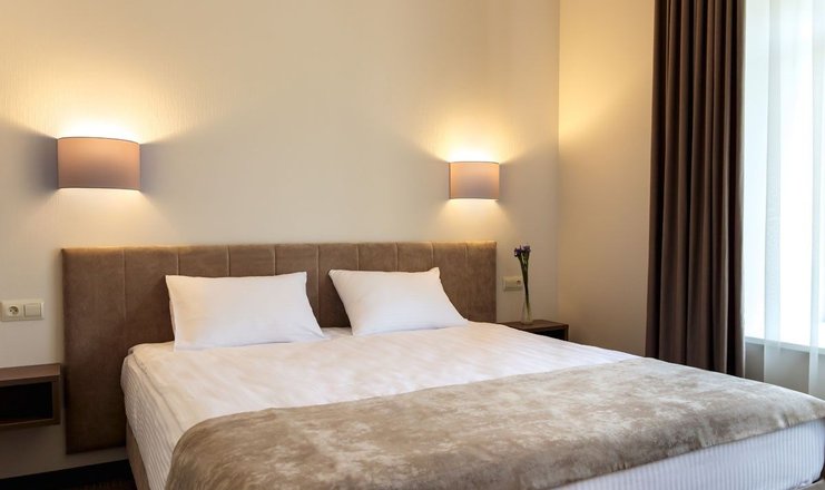 В номере: вешалка, кровать двуспальная, прикроватные тумбочки, стол, стулья, шкаф, кондиционер, телевизор ЖК, телефон, холодильник, чайный набор посуды, электрочайник